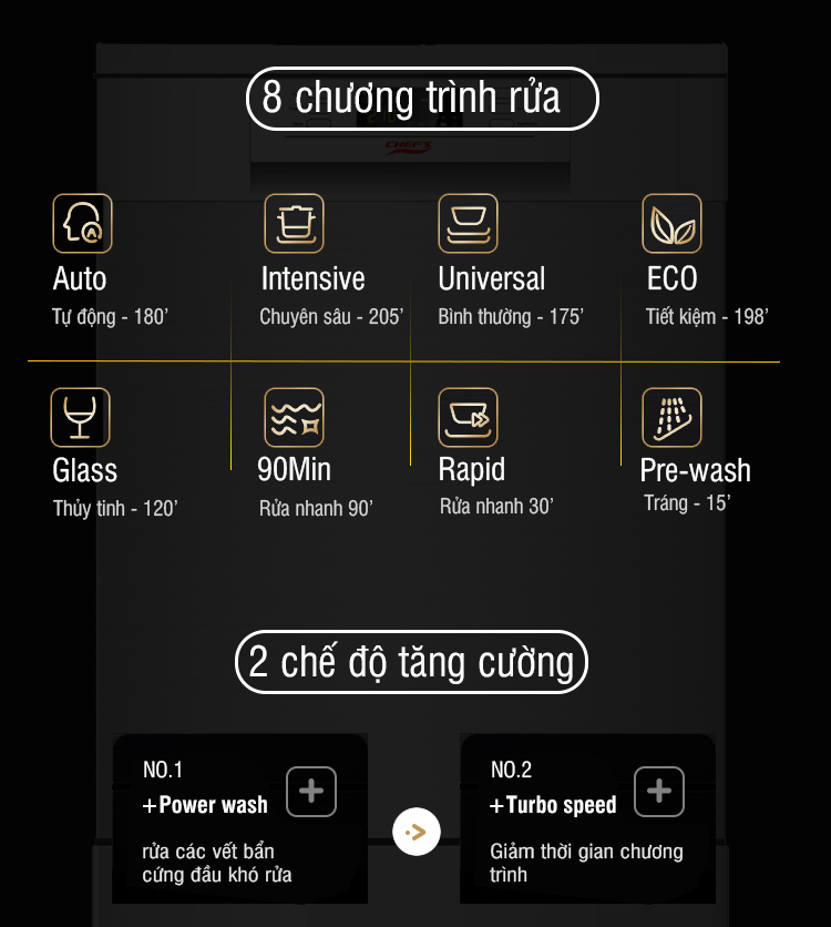 – 8 chương trình rửa tự động: Auto,Intensive,Universal,ECO,Glass,90min,Rapid,Pre-wash